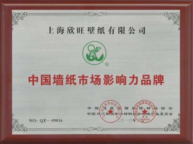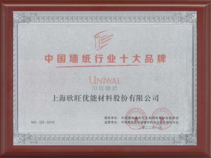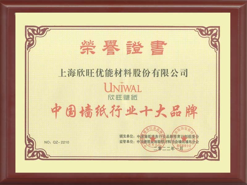 Honorary certificate of top ten brands in Chinese wallpaper industry